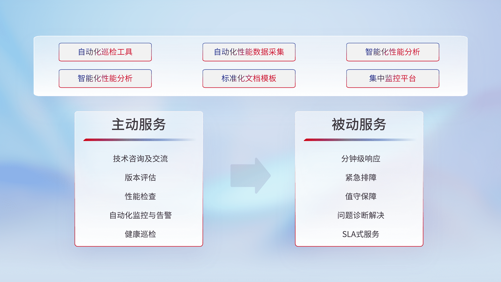 智能化工具和标准化文档,,,保障服务质量,,,,提供主动服务(包含技术咨询、、版本评估、、、、性能检查、、自动化监控与告警、、、、健康巡检)和被动服务包含(分钟级响应、、、、紧急排障、、、、值守保障、、、问题诊断解决、、、SLA服务)。。。
